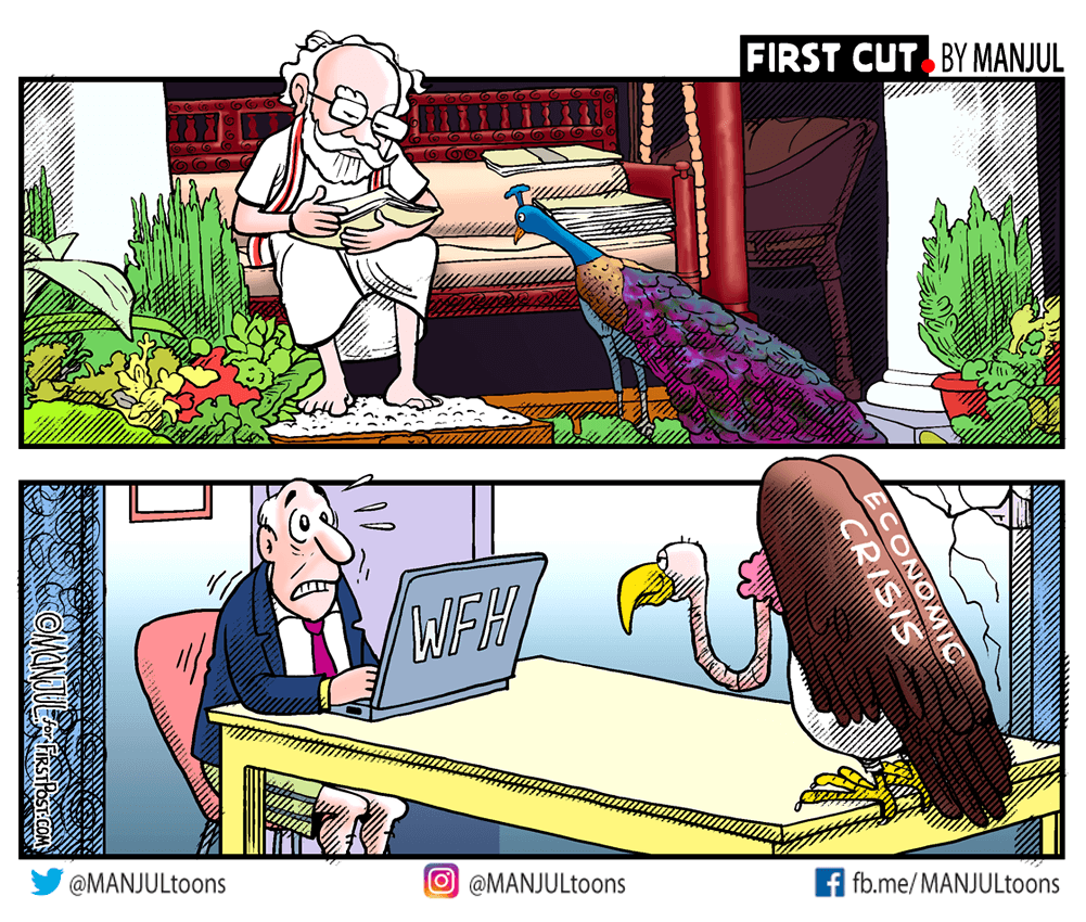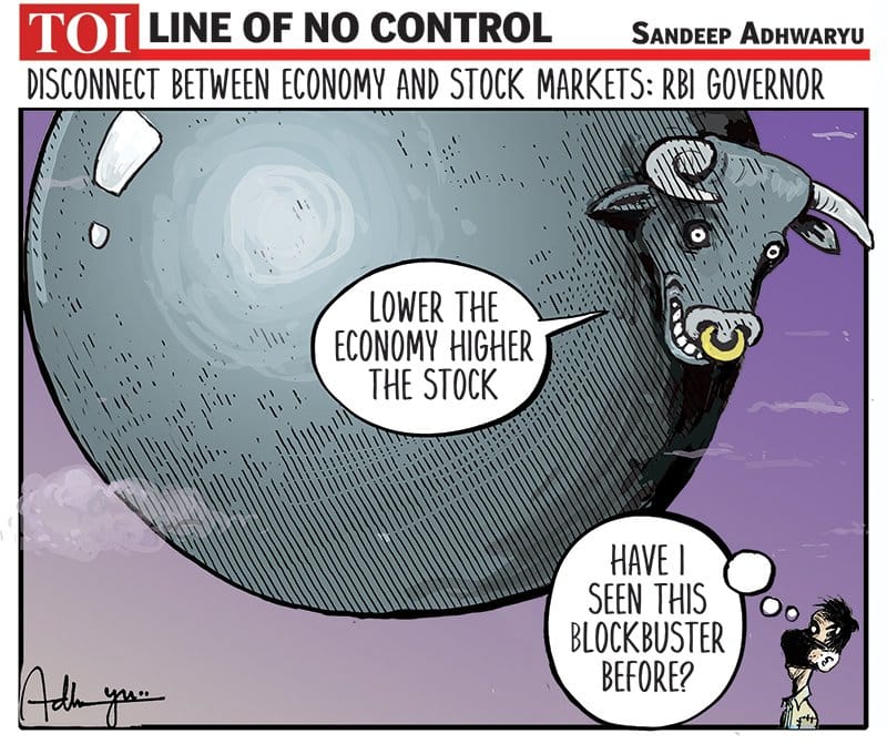 Sandeep Adhwaryu’s cartoon takes a ‘bullish’ jibe at the inverse relationship mismatch between stocks and economy.