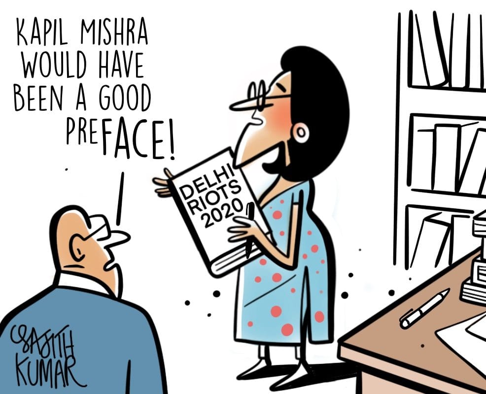 Sajith Kumar bases his drawing on publishing house Bloomsbury India’s decision to withdraw its upcoming book on the Delhi riots after it faced public outrage over a virtual pre-launch event that included BJP leader Kapil Mishra among its guests. Mishra’s speech in Northeast Delhi, just a day before the riots broke out, had sought the removal of anti-Citizenship Amendment Act protesters in the area.