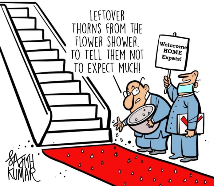 In today’s featured cartoon, Sajith Kumar sets the expectations of expats coming home straight.