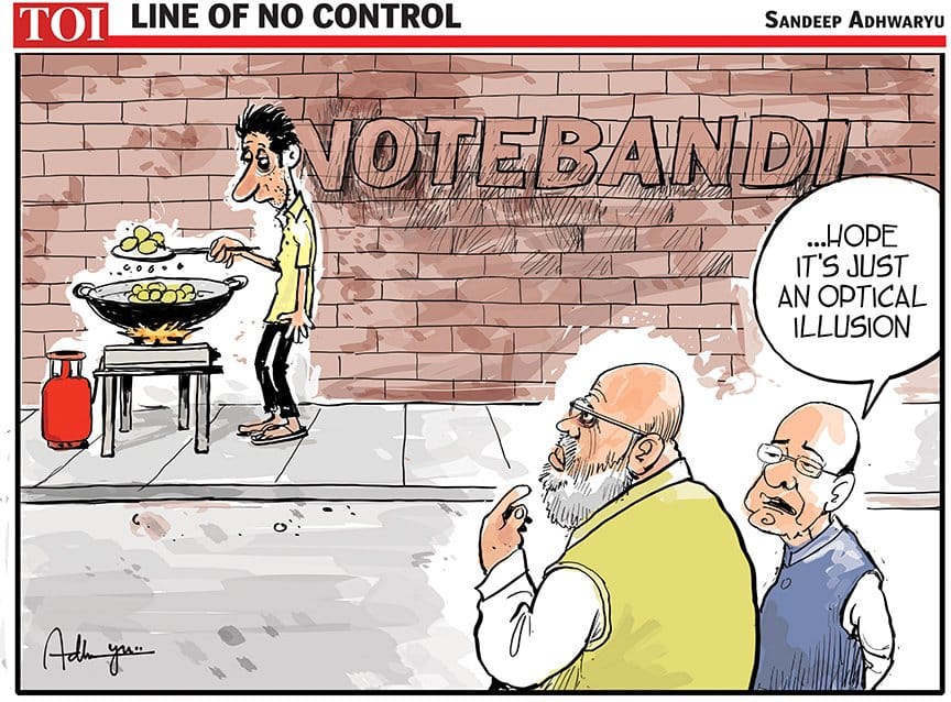 In The Times of India, Sandeep Adhwaryu’s creates a wonderful illusion of ‘Notebandi/Votebandi’ for BJP leaders as they prepare for some crucial elections.