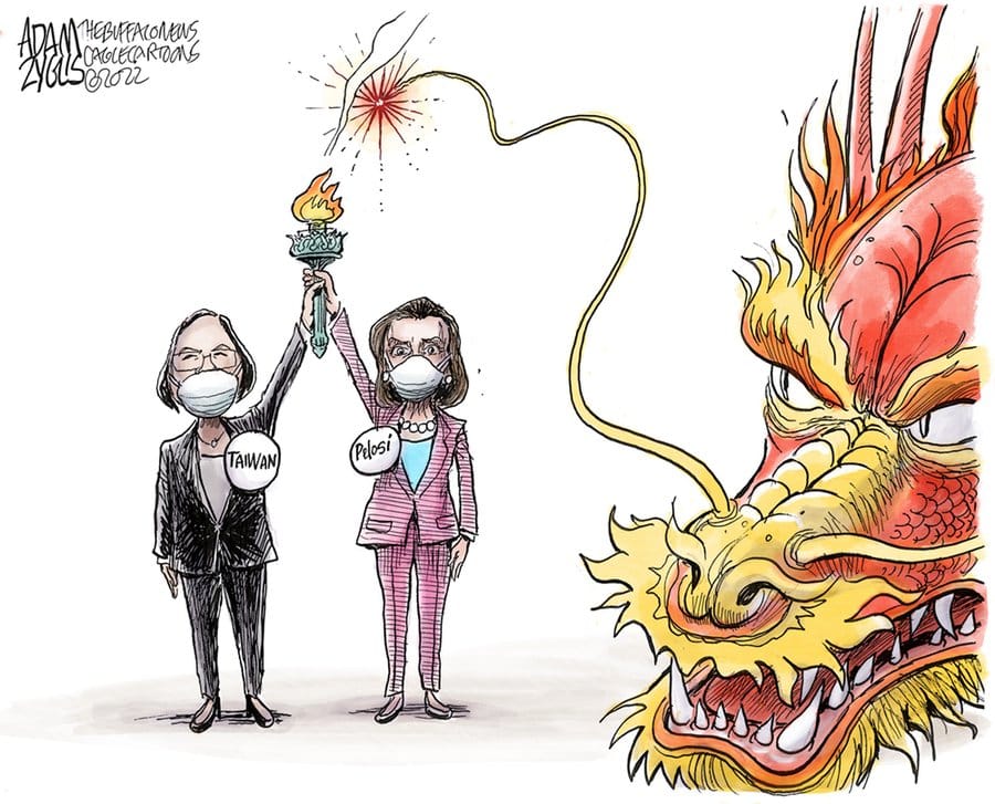 Adam Zyglis refers to Nancy Pelosi’s visit to Taiwan. While US House Speaker Nancy Pelosi received a hero’s welcome in Taiwan, her visit brought condemnation and threats of a military response from China, further straining relations between Washington and Beijing.