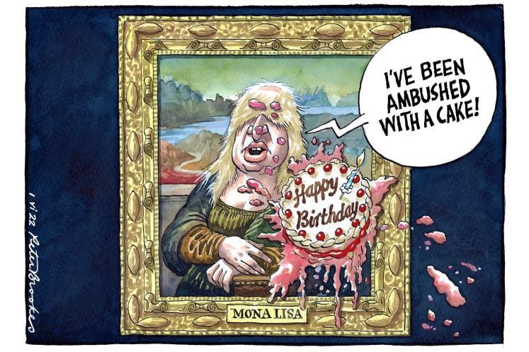 Peter Brookes refers to last week’s vandalism involving one of the world’s most famous paintings — the Mona Lisa by Leonardo Da Vinci. A man dressed as an old lady allegedly smeared cake cream on the painting at the Louvre in Paris last week.