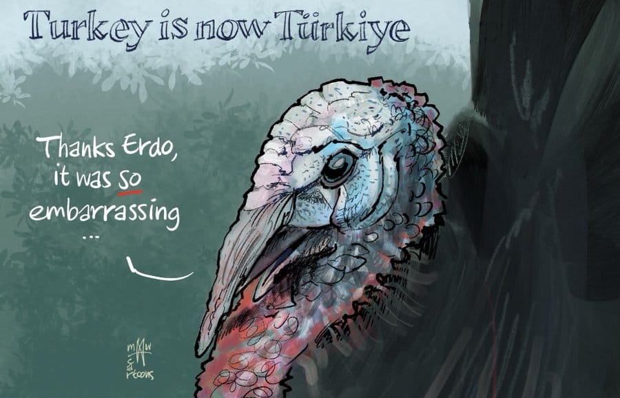 Maarten Wolterink comments on Turkey’s government letter to the United Nations formally asking for its name to be changed to Türkiye. The move is widely seen as a push by President Recep Tayyip Erdoğan’s government to rebrand the country and dissociate it from turkey, a large bird native to North America that’s served for Thanksgiving and Christmas.