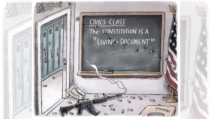In today’s featured cartoon, Adam Zyglis mocks the Second Amendment — which gives US citizens the right to bear arms. The mass shooting at Robb Elementary in Uvalde, Texas, left 21 people — 19 children and two teachers — dead and once again sparked debate about strict gun control laws. Conservatives widely cite the amendment to justify their opposition to any new form of gun control.