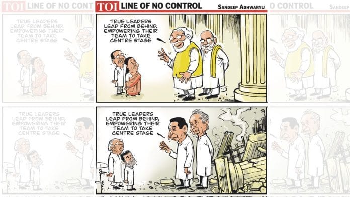 In today’s featured cartoon, Adhwaryu cleverly portrays the inter-party relationships of the Congress and BJP through their state chief minister choices. While the BJP is seen as a central stronghold party with Modi and Shah at the helm, Rahul Gandhi and Kharge’s hold on the Congress chief ministers is not as strong.