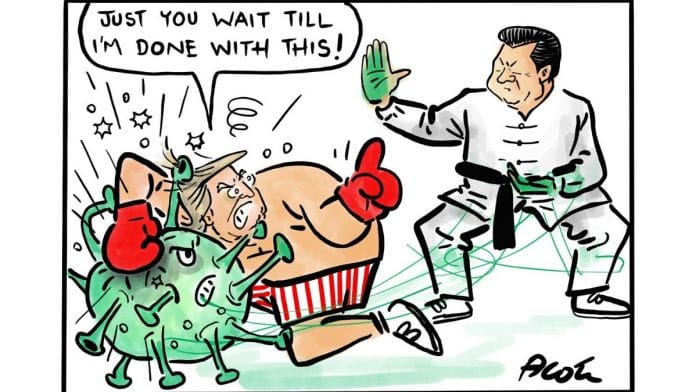 In today’s featured cartoon, Alok Nirantar alludes to the brewing tension between US and China over the coronavirus crisis.