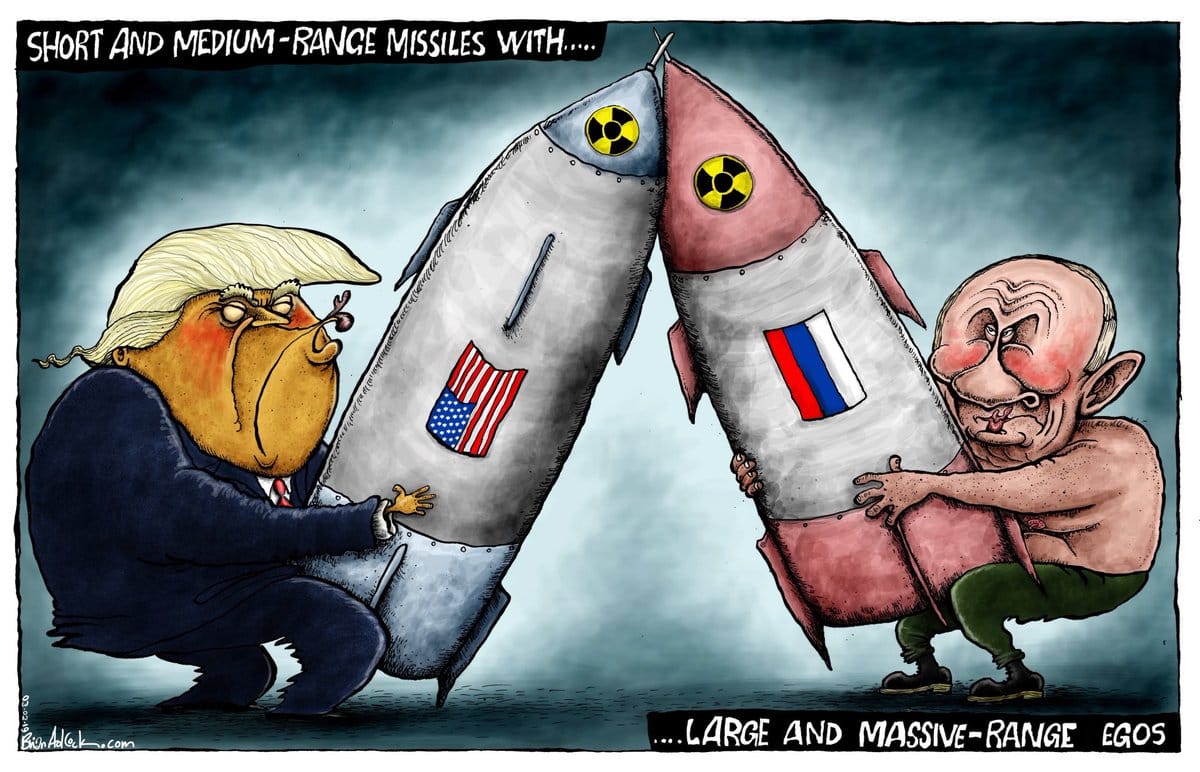 Brian Adcock provides another spin on the same issue, depicting US President Donald Trump and Russian President Vladimir Putin having a clash of their “massive” egos while armed with nuclear missiles.