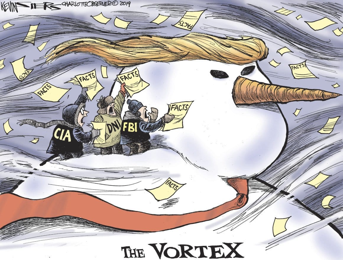 Kevin Siers for Politico uses the polar vortex that has brought unprecedented cold winds to America to draw an interesting parallel. Donald Trump is shown as a giant snowman who is blowing through all the facts gathered by US security agencies like the FBI, CIA and the Director of National Intelligence.