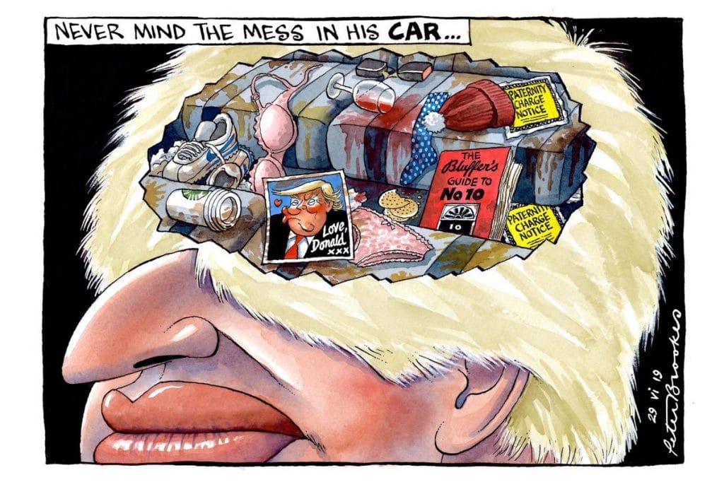 Some earlier news stories indicated the extent of the mess in British Prime Ministerial candidate Boris Johnson’s car. Peter Brookes suggests that Johnson’s brain is no better, and that he likes Donald Trump.