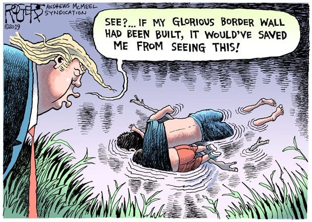 Delivering a speech at Osaka, US President Donald Trump claimed that his proposed border wall could have saved the man and his daughter who drowned while trying to cross a river. In this cartoon, Rob Rogers attacks Trump for his lack of sensitivity on the incident.