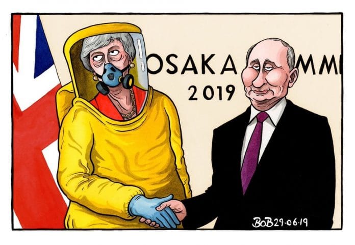 In today’s featured cartoon, Bob Moran depicts the apparent aloofness which characterised the handshake between British Prime Minister Theresa May and Russian President Vladimir Putin at the G20 summit in Osaka.