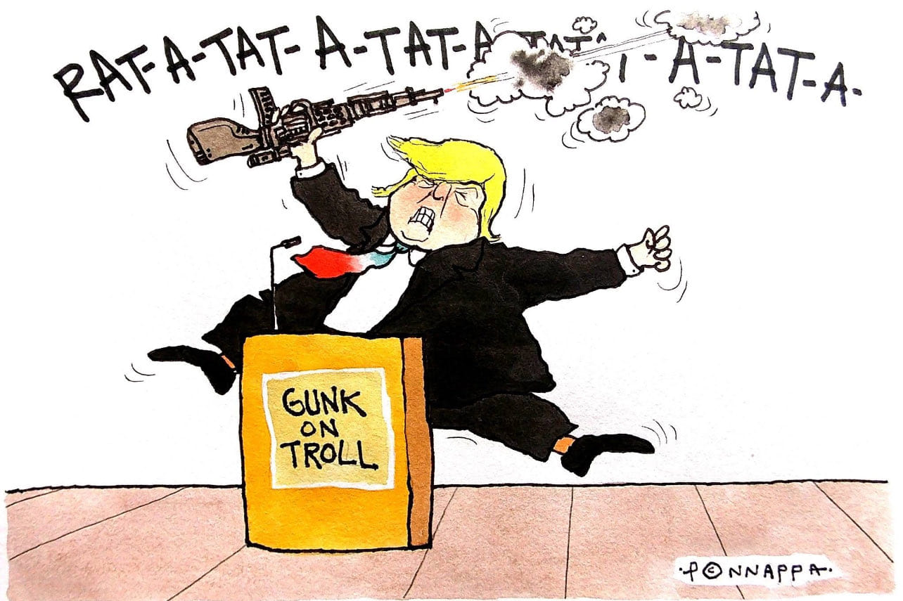 The selected cartoons appeared first in other publications, either in print, online, or on social media, and are credited appropriately.