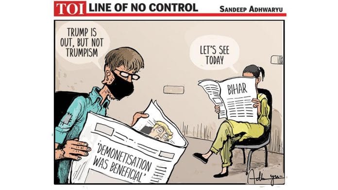 In today’s featured cartoon, Sandeep Adhwaryu draws parallels between the US presidential elections and Bihar polls. He notes that Trump may have lost the elections but his polarising politics continue in the country, and it remains to be seen if that will be the case for Bihar as well.