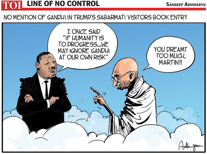 In today’s featured cartoon, Alok Nirantar pokes fun at US President Donald Trump’s visit to the Sabarmati Ashram and his aversion to ‘truth’.