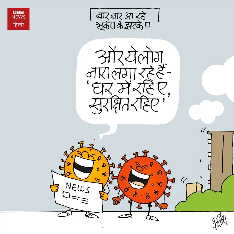 Kirtish Bhatt illustrates how there is danger inside and outside the house, referring to the recent spate of earthquakes across the country.