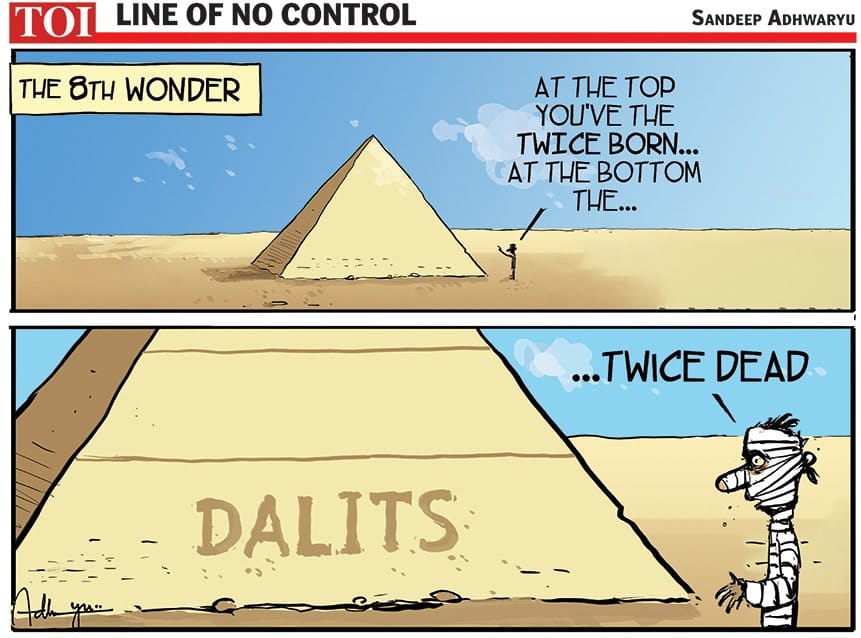 Sandeep Adhwaryu’s cartoon depicts the plight of Dalits in India in wake of the recent incident in Rajasthan, where two Dalit youths were beaten and tortured brutally.