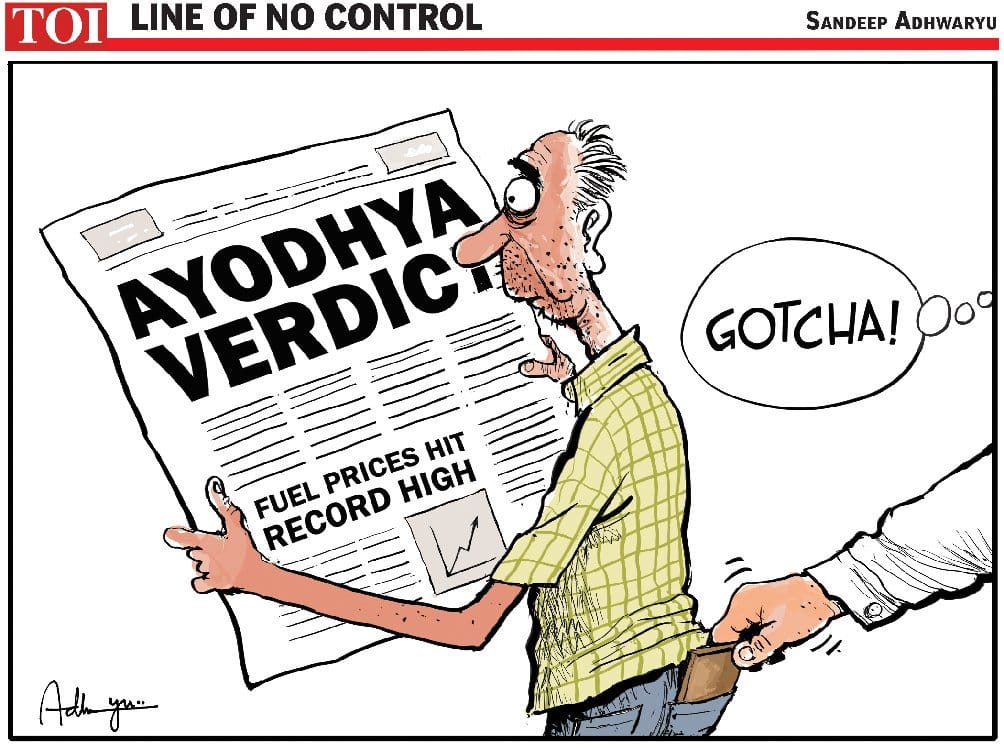 In The Times of India, Sandeep Adhwaryu suggests that people are being cheated of their money as they deal with the fuel price hike even as the national focus remains on the Ayodhya verdict.