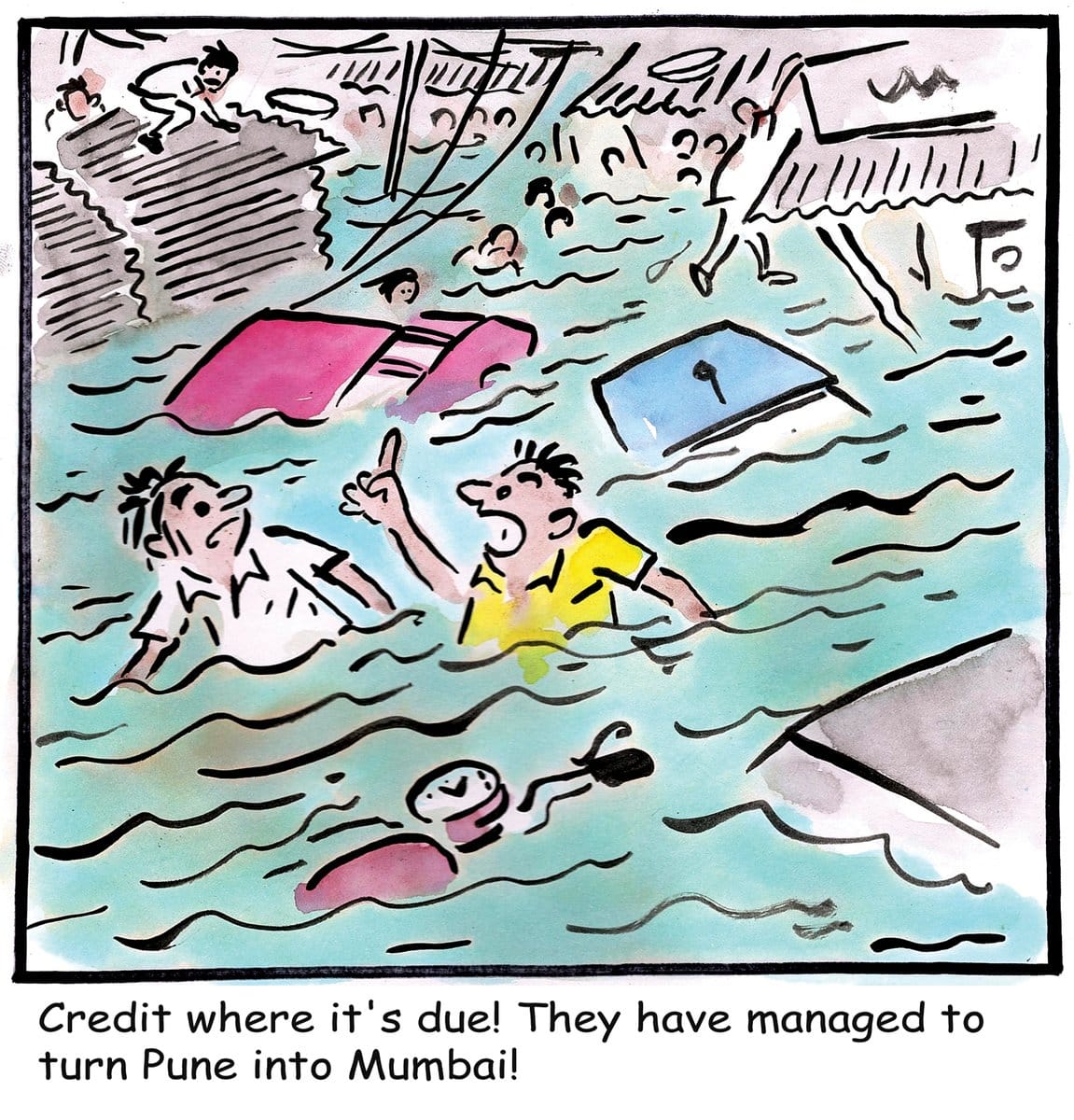 After the breach in Pune’s Mutha canal wall Thursday which left several areas in the city flooded, cartoonist Alok Nirantar compares it with the Mumbai floods.