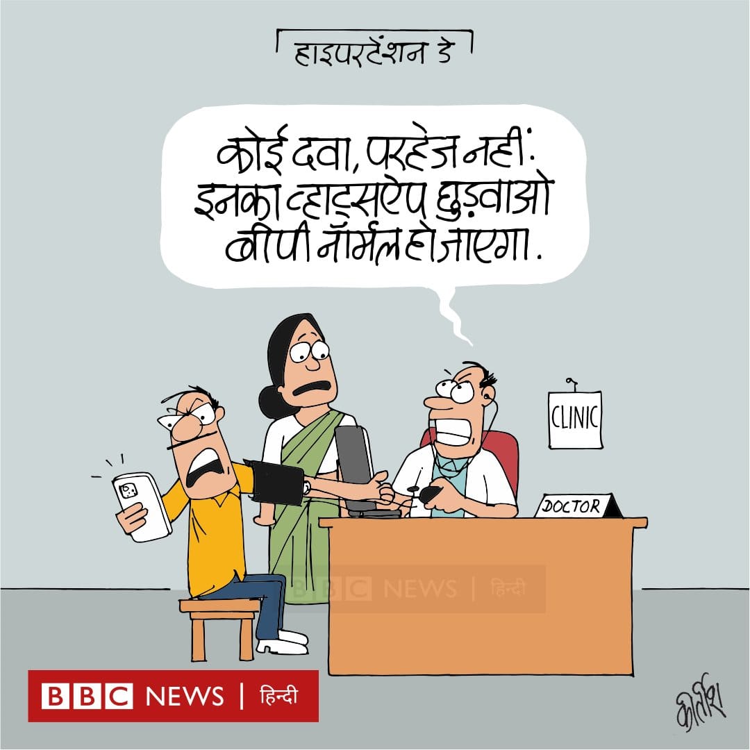 Kirtish Bhatt talks about how relentless mobile scrolling has taken a toll on people’s health. The cartoon shows a doctor telling his patient on World Hypertension Day (17 May) that his blood pressure would become normal if he gave up WhatsApping.