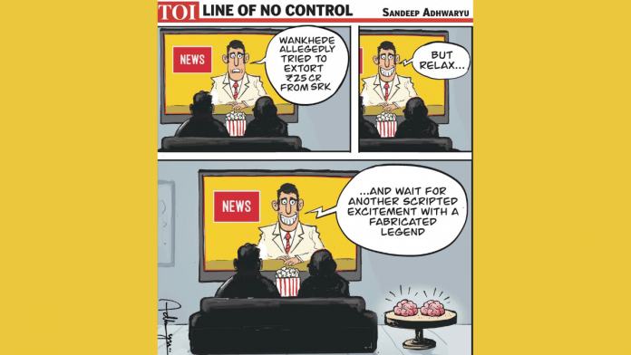 In today’s featured cartoon, Sandeep Adhwaryu refers to the controvery surrounding Shah Rukh Khan’s son Aryan’s arrest in which ex-NCB director Sameer Wankhede has been summoned for allegedly asking for Rs 25 crore bribe to “settle the case”. Wankhede arrested Aryan Khan in a drugs case in 2021. Adhwaryu mocks at the breathless way the media had covered the case.