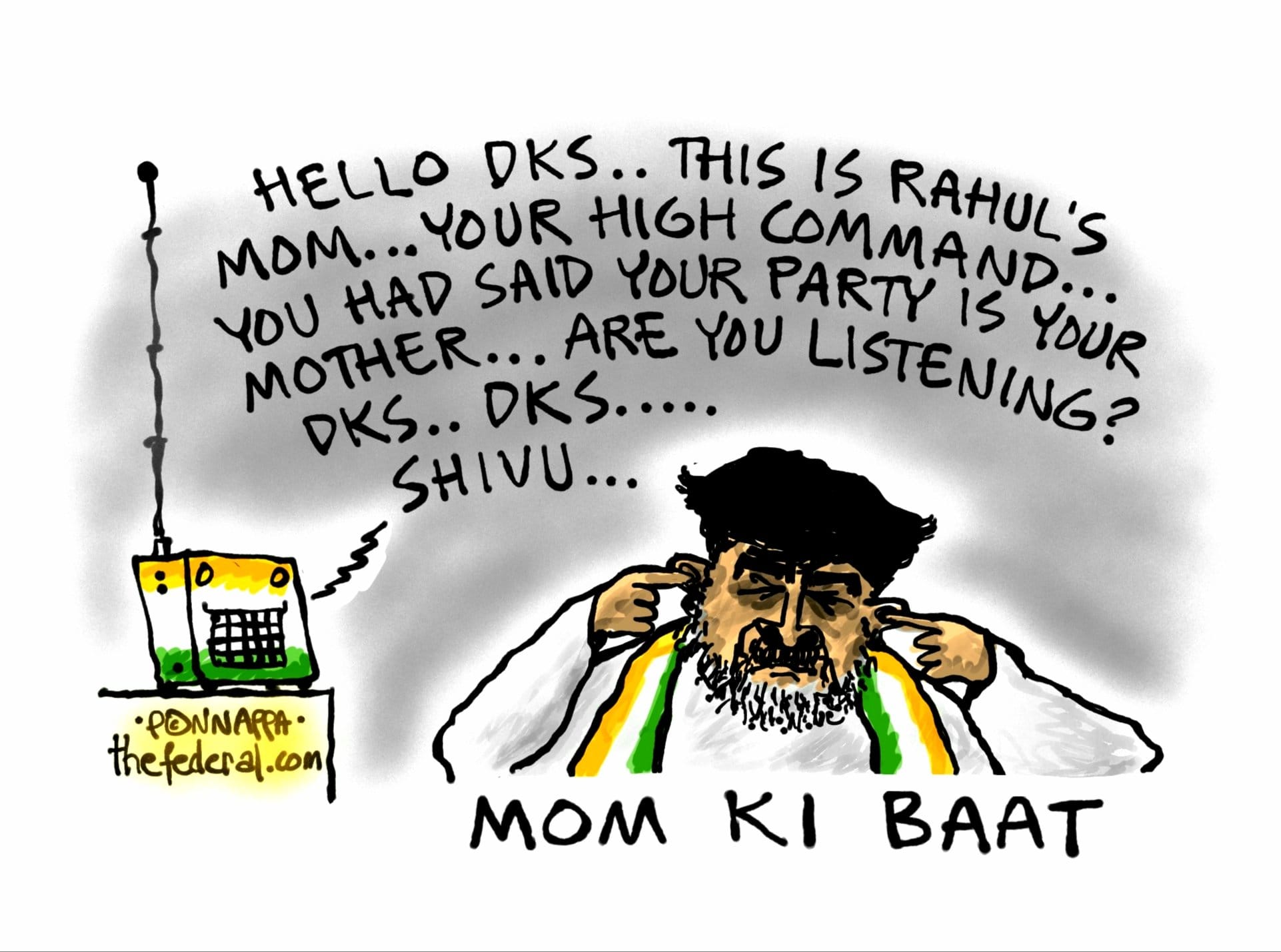 Nala Ponnappa hints at the supposed role Congress leader Sonia Gandhi may have played in breaking the logjam over the chief minister’s chair in Karnataka. He plays on the word “mother” since state party chief D.K. Shivakumar called the party his mother. “This is Rahul’s mom…,” says the voice floating out of a tri-coloured walkie-talkie as DKS covers his ears with his hands in the cartoon.