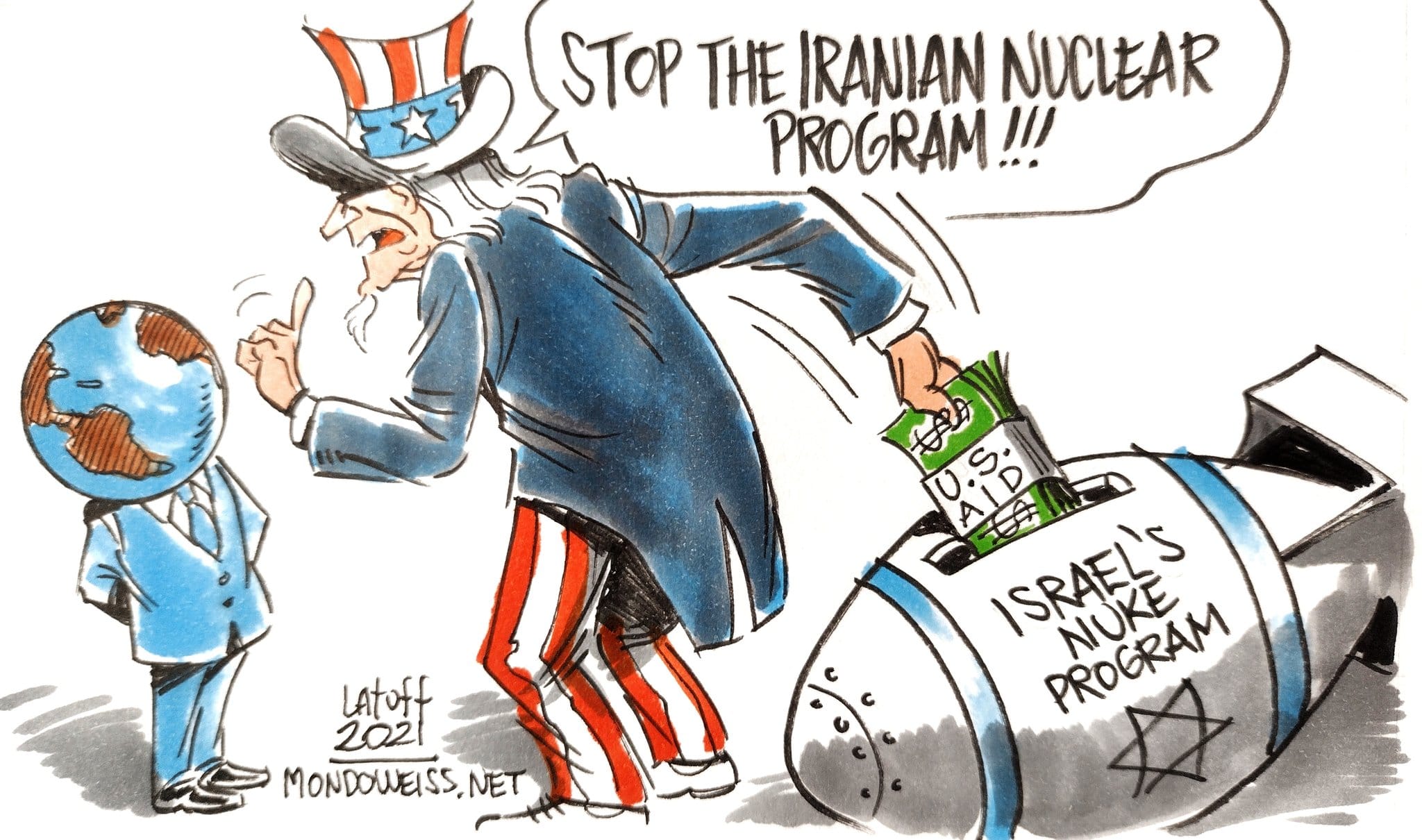 Carlos Latuff takes a swipe at US’ funding of Israel’s nuclear program even as it urges the world to stop the nuclear powering up by Iran, and chooses to step away from the Iran-US nuclear deal.