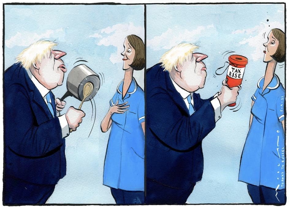 The cartoon satirises Tory MPs’ reaction to UK PM Boris Johnson’s plan to raise taxes to pay for social care reform.