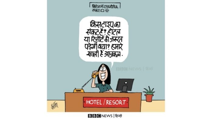 In today’s featured cartoon, Kirtish Bhatt refers to the back-to-back resignations by Tory ministers that forced British Prime Minister Boris Johnson to step down as leader of the Conservative Party, while alluding to the ‘resort politics’ often seen in India — where legislators who defect or are at risk of defecting to other parties are sequestered in hotels or resorts. The illustration shows a hotel receptionist telling someone over the phone: “What type of crisis is it? Will you need a hotel or a resort? Ours are empty these days.”