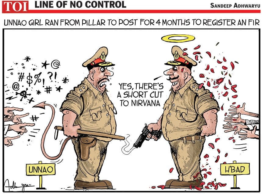 Sandeep Adhwaryu on the Unnao and Hyderabad rape cases. He depicts police officers being ‘showered with petals’ following the ‘encounter’ killings of those accused in the Hyderabad rape and murder case but also shamed for failing to file an FIR in the Unnao case. Good cop-bad cop?