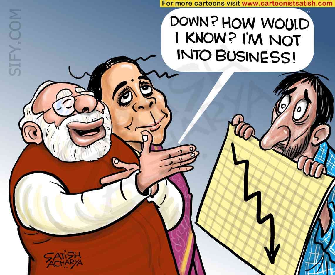 Satish Acharya’s take on India’s low GDP and Prime Minister Narendra Modi’s ignorance about it. The cartoonist also hints at Finance Minister Nirmala Sitharaman’s recent comment, in connection with the rising onion prices, that she doesn’t eat much onion and garlic and hails from a family where these two vegetables are not much in use.
