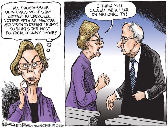 Siers depicts the heated exchange between Elizabeth Warren and Bernie Sanders wherein she accused him of calling her a liar on national TV. This was despite progressive Democrats calling for a truce in order to defeat US President Trump in the upcoming elections.