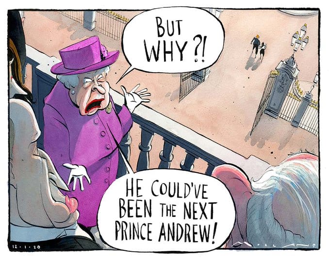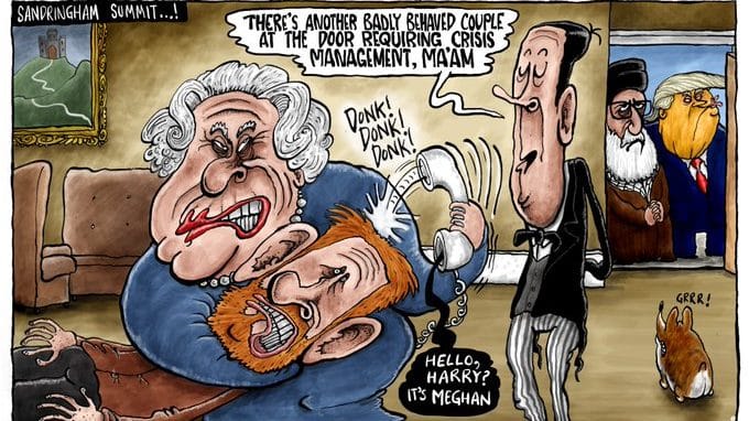 In today’s featured cartoon, Brian Adcock takes a dig at the US-Iran tensions as well as UK’s Prince Harry taking a step back from his royal duties. Adcock depicts Queen Elizabeth trying to beat some sense into her grandson Harry when his wife Meghan Markle calls, while US President Donald Trump and Iran’s supreme leader Ayatollah Khamenei wait outside the door as another couple in dire need of ‘crisis management’.