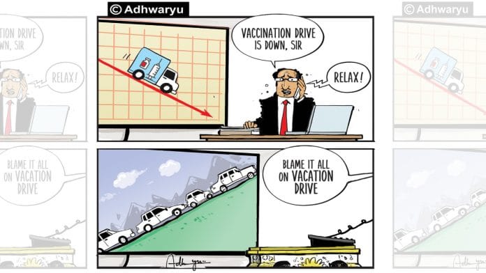 In today’s featured cartoon, Sandeep Adhwaryu draws a contrast between ‘vaccination drive’ and ‘vacation drive’, amid growing concerns of tourists flouting Covid-19 norms.