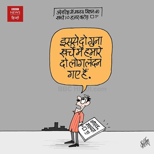 In BBC News Hindi, Kirtish Bhatt takes a dig at Prime Minister Narendra Modi’s Independence Day speech. Modi said that by 2022, India will send a manned mission to space which will cost around Rs 10,000 crore. The cartoonist wonders that businessmen Vijay Mallya and Nirav Modi, both fugitives, had flown to the UK at double the cost.