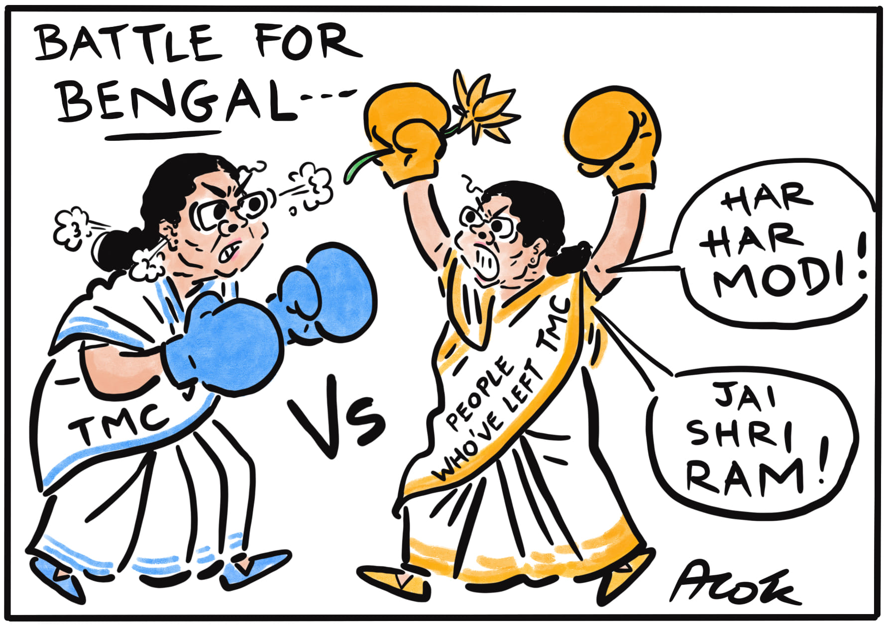 In today’s featured cartoon, Sandeep Adhwaryu illustrates on PM Modi’s remarks on BJP’s ‘politics of development’ vs ‘TMC’s model of corruption and violence’.