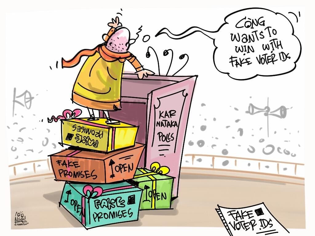 Mika Aziz in the Indian Express mocks the BJP’s claim that the Congress is out to win the elections with fake voter IDs given the BJP has been making empty promises to voters over the years.