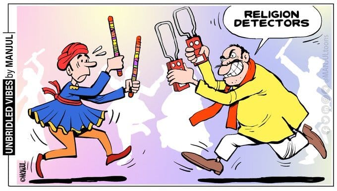 In today’s featured cartoon, Manjul refers to right-wing Hindu outfit Bajrang Dal’s claims that it’s working on curbing ‘love jihad’ during Navratri. Alleged incidents of Muslim youth trying to enter garba venues last week have stoked controversy in Gujarat and Madhya Pradesh, where Bajrang Dal workers are conducting surprise checks like demanding to see ID cards and applying a teeka (vermillion) on the forehead of people entering.