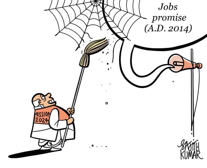 Sajith Kumar, too, pokes fun at the Centre’s promise of 10 lakh jobs, hinting that it may have something to do with the 2024 Lok Sabha elections.