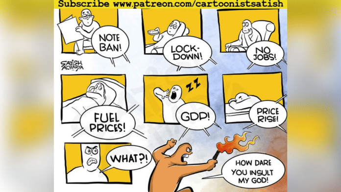 In today’s featured cartoon, Satish Acharya offers his take on issues that prompt outrage in India, seeking to note that it is often driven by misplaced priorities.