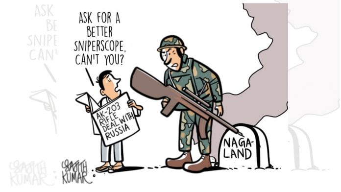 In today’s featured cartoon, Sajith Kumar links the deal signed between India and Russia for manufacturing AK-203 rifles in Uttar Pradesh to the civilian killings in Nagaland.