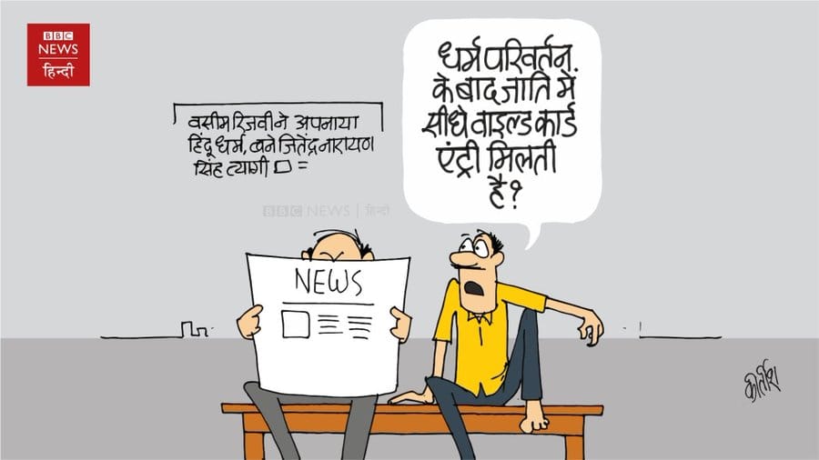Kirtish Bhatt’s take on Waseem Rizvi, ex-chairman of Shia Waqf Board in UP, converting to Hinduism. The man on the right asks his companion if one gets a wild card entry into caste upon converting.
