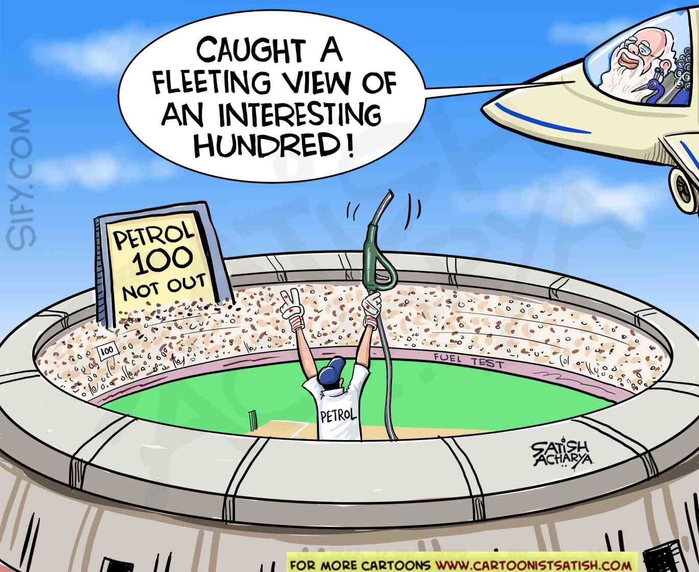 Satish Acharya takes a swipe at the Modi government after petrol prices crossed the Rs 100 per litre-mark in some cities over the weekend. He juxtaposes the rise in fuel price to the PM’s recent tweet that he had caught a “fleeting view” of the ongoing India-England Test series in Chennai.