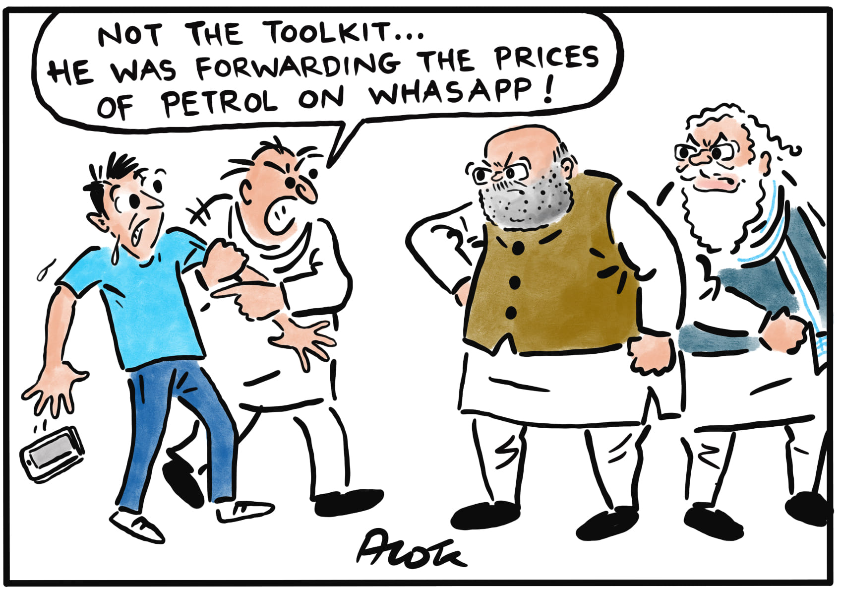 In today’s featured cartoon, Sandeep Adhwaryu alludes to the arrest of 21-year-old climate activist Disha Ravi as he illustrates on what the controversial ‘toolkit’, for which she has been held, looks like.