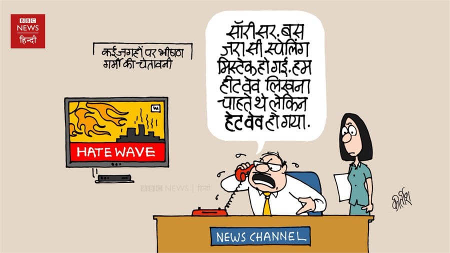 Kirtish Bhatt points to the rising temperatures across the country, literally and figuratively, thanks to the heat wave and incidents of hate in many states. He illustrates a news channel head apologising for misspelling ‘heat wave’ as ‘hate wave’.