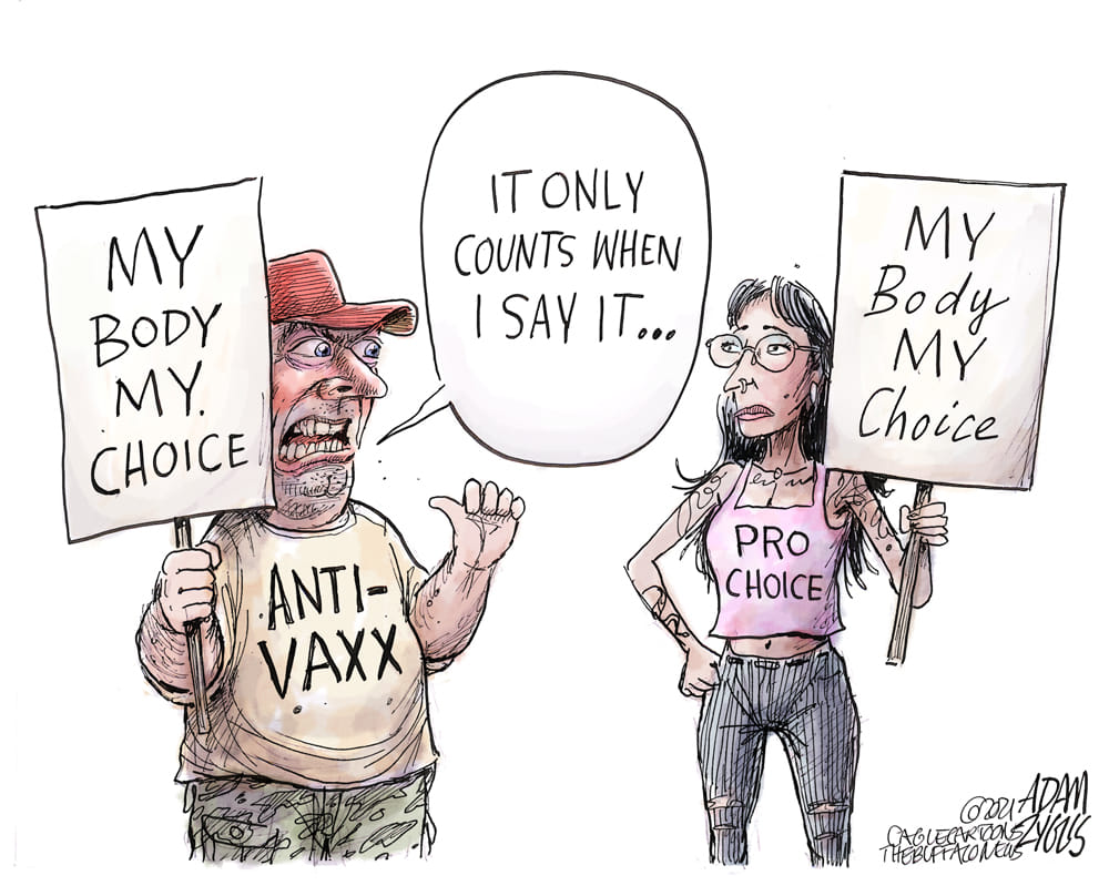Adam Zyglis takes a dig at the growing anti-vaccination movement in the US, by contrasting it to the criticisms meted out to the ‘pro-choice’ women’s movement.