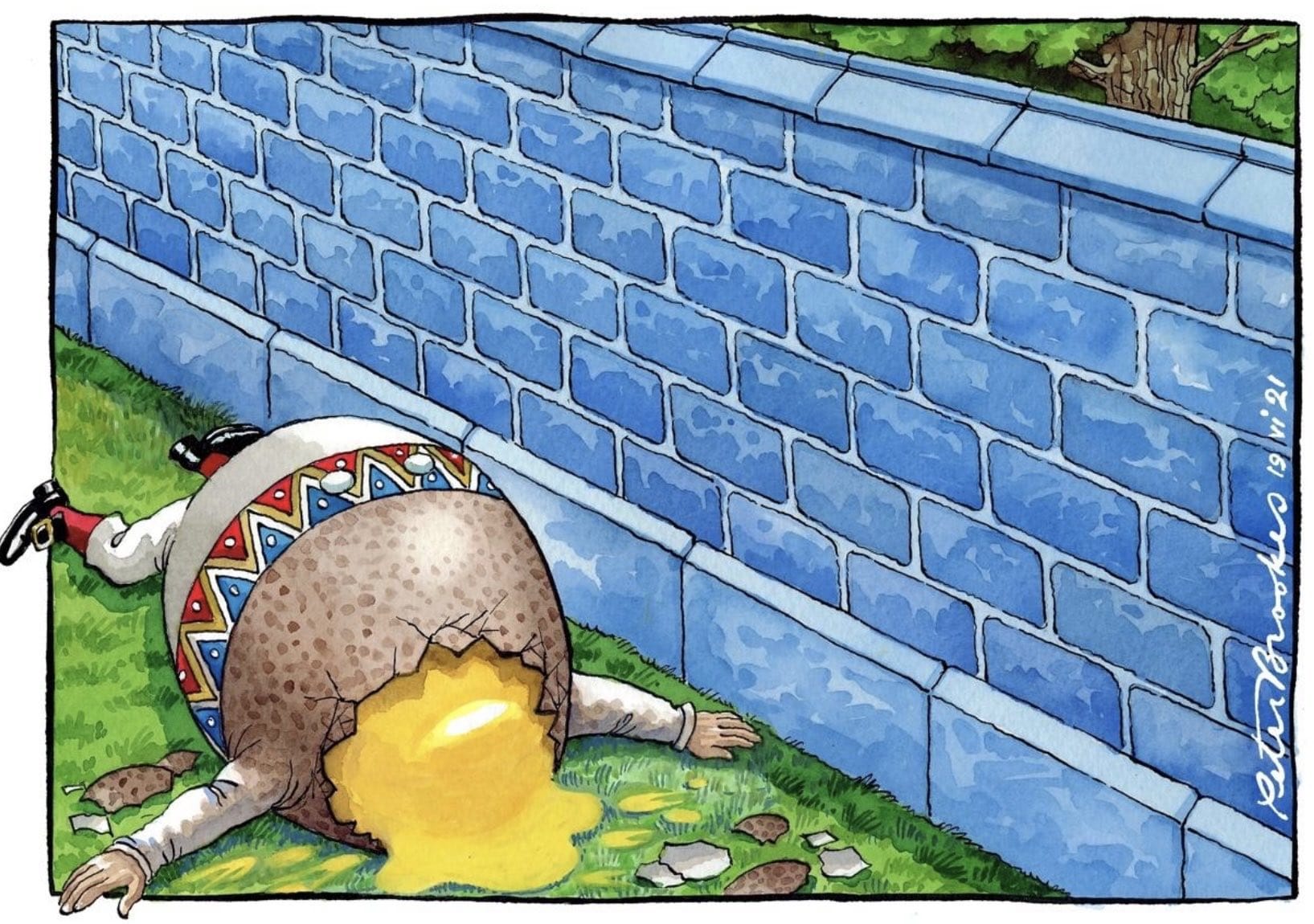 Peter Brookes depicts UK PM Boris Johnson as Humpty Dumpty falling off the “blue” Liberal-Dem wall, after the Conservative Party suffered a critical by-election defeat in Chesham & Amersham.
