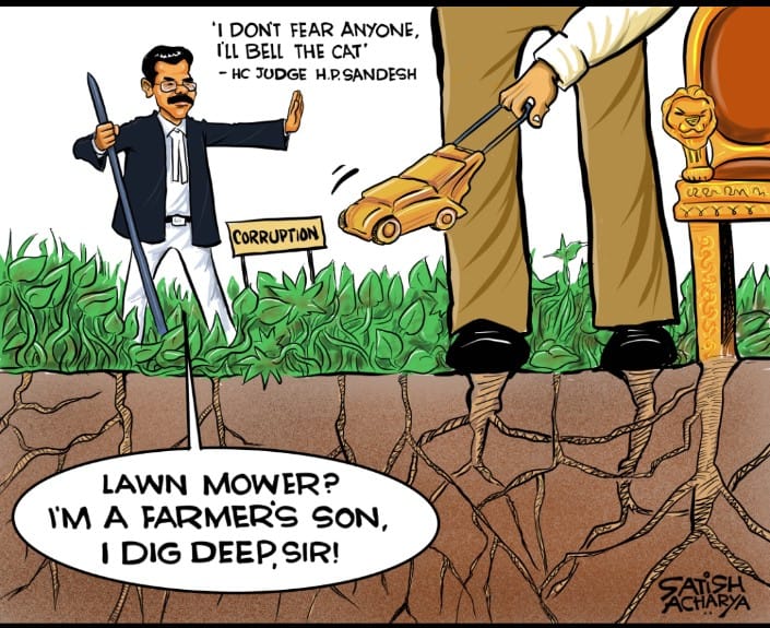 Satish Acharya praises Justice H.P. Sandesh of the Karnataka High Court, who claimed during a hearing last week that he was threatened with a transfer over his criticism of the state’s Anti-Corruption Bureau (ACB). “I don’t fear anyone. I am ready to bell the cat. I have not accumulated property after becoming a judge. I don’t care if I lose the position. I am the son of a farmer,” the judge had said.