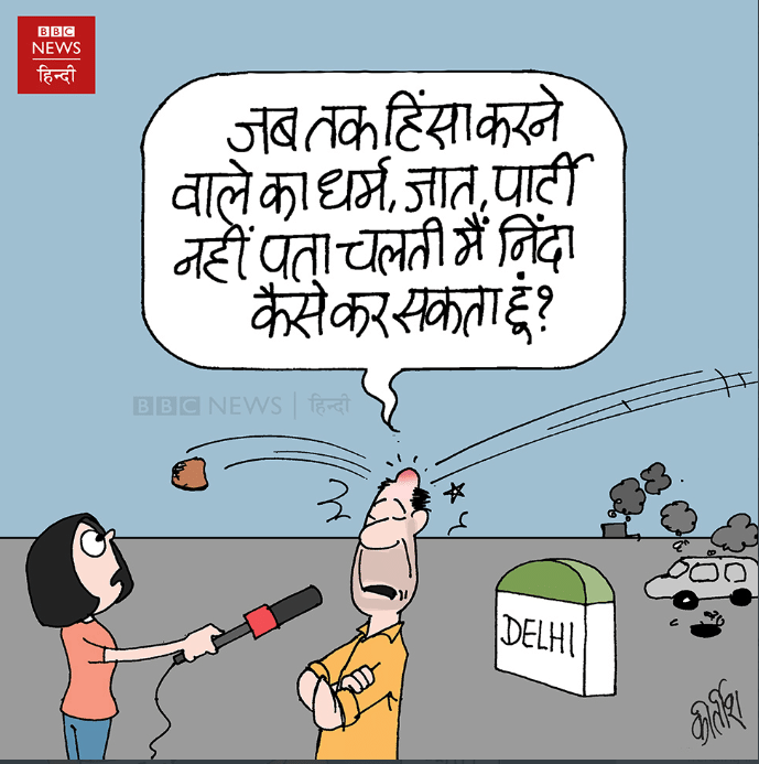 In the day’s cartoon, Kirtish Bhatt draws on people refraining from condemning the violence over caste and religious allegiances.