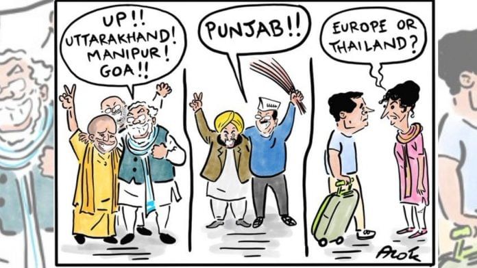 In today’s featured cartoon, Alok Nirantar takes a dig at the Congress’ dismal performance in this year’s assembly elections. The party suffered a drubbing in all five states that went to polls, and lost Punjab, where it was the incumbent, to the Aam Aadmi Party (AAP).