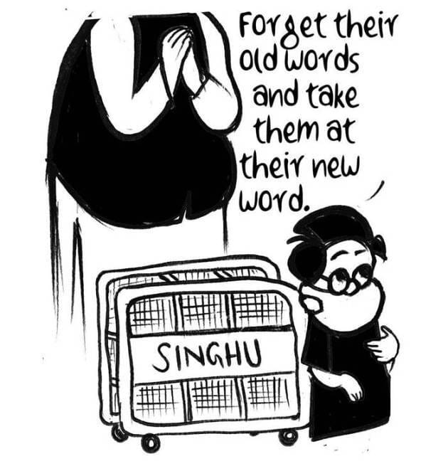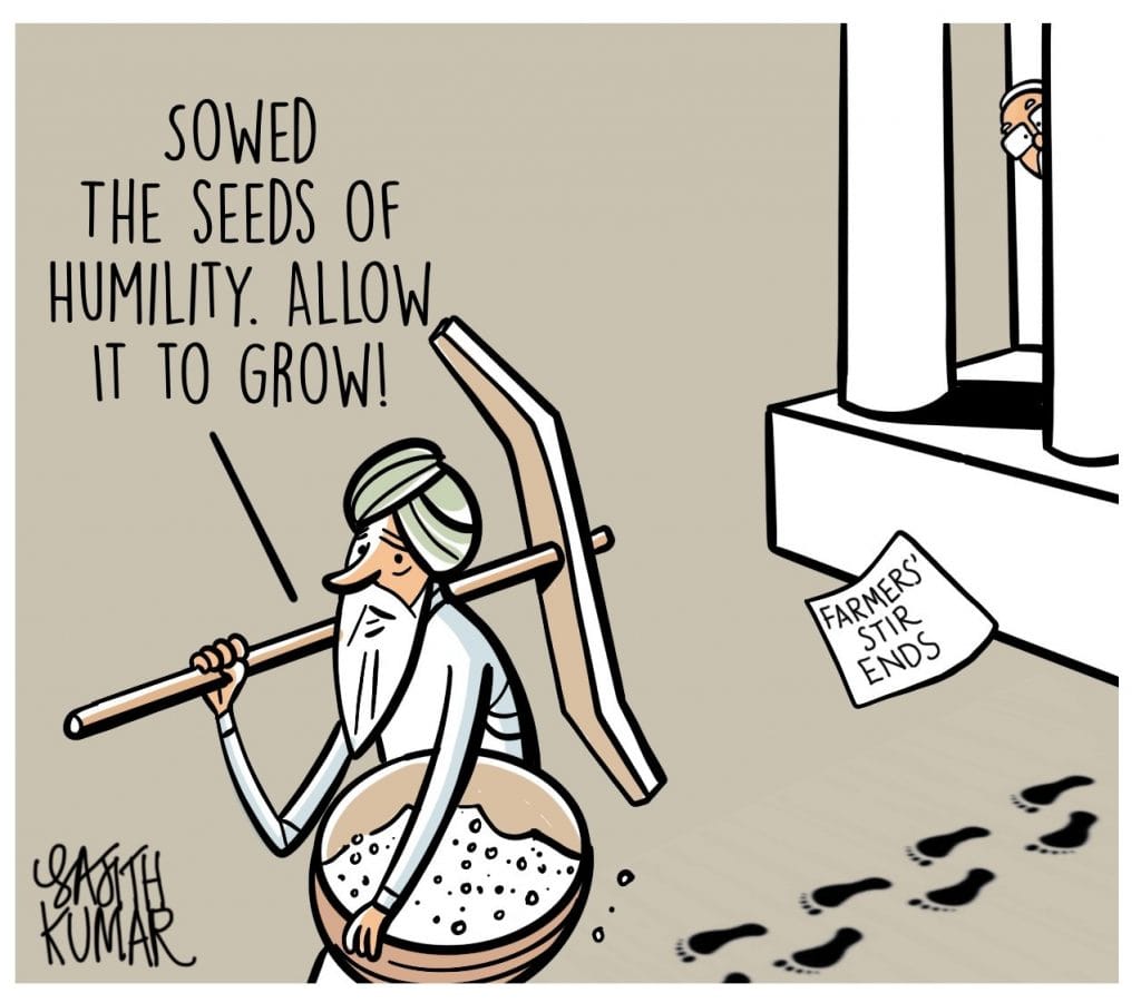 In today’s featured cartoon, Alok Nirantar illustrates a farmer thanking ‘elections’ for the Narendra Modi government agreeing to several pending demands, which has brought their year-long protests on the borders of Delhi to an end.